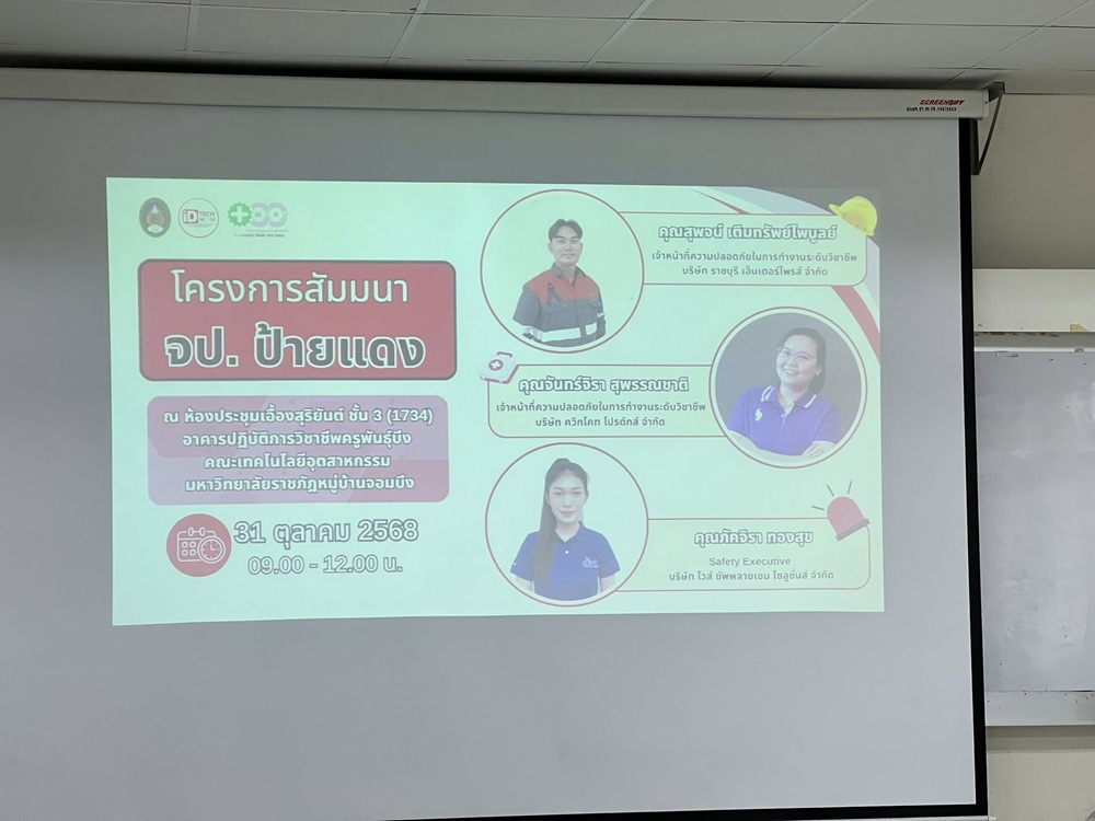 วันที่ 31 ตุลาคม 2568 สาขาวิชาอาชีวอนามัยและความปลอดภัย คณะเทคโนโลยีอุตสาหกรรม มหาวิทยาลัยราชภัฏหมู่บ้านจอมบึง จัดโครงการสัมมนา “จป. ป้ายแดง” ณ ห้องประชุมเอื้องสุริยัน ชั้น 3 อาคารปฏิบัติการวิชาชีพครูพันธุ์บึง คณะเทคโนโลยีอุตสาหกรรม