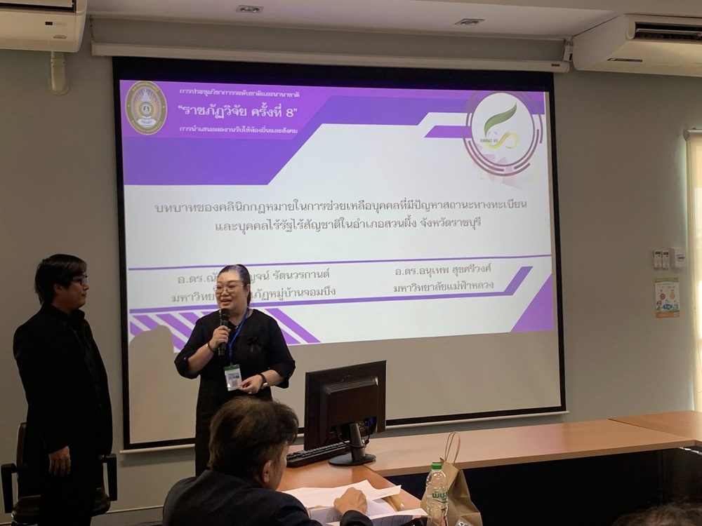 อาจารย์ ดร.ณัชญากัญจน์ รัตนวรกานต์ ผลงานเรื่อง: บทบาทของคลินิกกฎหมายในการขับเคลื่อนเพื่อแก้ปัญหาบุคคลไร้สัญชาติและสถานะบุคคลในอำเภอสวนผึ้ง จังหวัดราชบุรี นำเสนอการทำงานของคลินิกกฎหมายเพื่อช่วยเหลือประชาชนกลุ่มเปราะบาง สร้างความเท่าเทียมและเข้าถึงสิทธิตามกฎหมาย