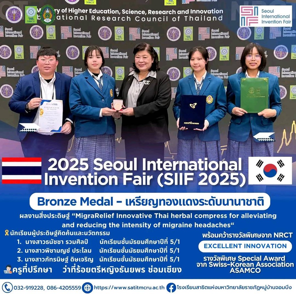 มหาวิทยาลัยราชภัฏหมู่บ้านจอมบึง ขอแสดงความยินดีกับนักเรียนโรงเรียนสาธิตแห่งมหาวิทยาลัยราชภัฏหมู่บ้านจอมบึง ที่สร้างชื่อเสียงในระดับนานาชาติ คว้ารางวัล เหรียญทองแดง (Bronze Medal) พร้อมรางวัลพิเศษ “Excellent Innovation” จากสำนักงานการวิจัยแห่งชาติ (NRCT) และ Special Award จาก Swiss–Korean Association ASAMCO จากการเข้าร่วมประกวดและจัดแสดงในงาน “2025 Seoul International Invention Fair” (SIIF 2025) จัดขึ้นระหว่างวันที่ 3 – 6 ธันวาคม 2568 ณ กรุงโซล สาธารณรัฐเกาหลี