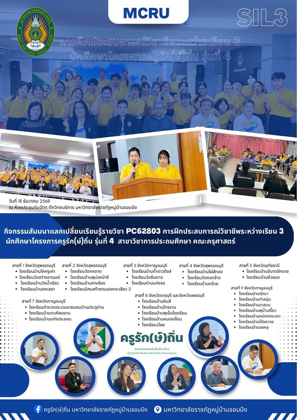 วันที่ 18 ธันวาคม พ.ศ. 2568 คณะครุศาสตร์ มหาวิทยาลัยราชภัฏหมู่บ้านจอมบึง ได้จัด กิจกรรมสัมมนาแลกเปลี่ยนเรียนรู้ ครั้งที่ 3 ในรายวิชา PC62803 การฝึกประสบการณ์วิชาชีพระหว่างเรียน 3 สำหรับนักศึกษา โครงการครูรัก(ษ์)ถิ่น รุ่นที่ 4 สาขาวิชาการประถมศึกษา ณ ห้องประชุมร่มฉัตร อาคารสำนักวิทยบริการและเทคโนโลยีสารสนเทศ มหาวิทยาลัยราชภัฏหมู่บ้านจอมบึง