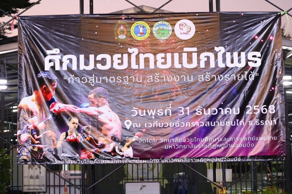 วิทยาลัยมวยไทยศึกษาและการแพทย์แผนไทย มหาวิทยาลัยราชภัฏหมู่บ้านจอมบึง รายงานความสำเร็จของกิจกรรมการแข่งขันมวยไทยส่งท้ายปีเก่า ต้อนรับปีใหม่ เคานต์ดาวน์ 2026 “ศึกมวยไทยเบิกไพร” ซึ่งจัดขึ้นเมื่อวันที่ 31 ธันวาคม 2568 ณ เวทีมวยชั่วคราว สนามชนไก่ ธ.ธิรญา