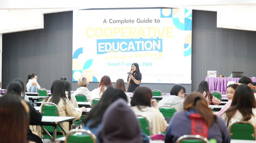 ในการนี้ ได้รับเกียรติจาก นางสาวธนารีย์ นุ่มกลิ่น นักแนะแนวการศึกษา เป็นวิทยากรบรรยายในหัวข้อ “A Complete Guide to Cooperative Education and Program Workflow”