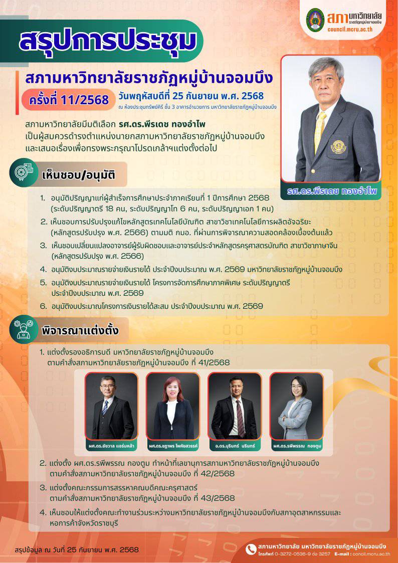 นายกสภามหาวิทยาลัยราชภัฏหมู่บ้านจอมบึงเป็นประธานการประชุมสภามหาวิทยาลัย ครั้งที่ 11/2568 ในการพิจารณาแต่งตั้งรองอธิการบดีและพิจารณาเลือกผู้สมควรดำรงตำแหน่งนายกสภามหาวิทยาลัย