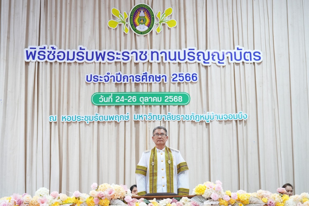 วันที่ 26 ตุลาคม 2568 มหาวิทยาลัยราชภัฏหมู่บ้านจอมบึง จัดพิธีการซ้อมใหญ่การเข้ารับพระราชทานปริญญาบัตร ประจำปีการศึกษา 2566 ณ หอประชุมรัตนพฤกษ์ มหาวิทยาลัยราชภัฏหมู่บ้านจอมบึง