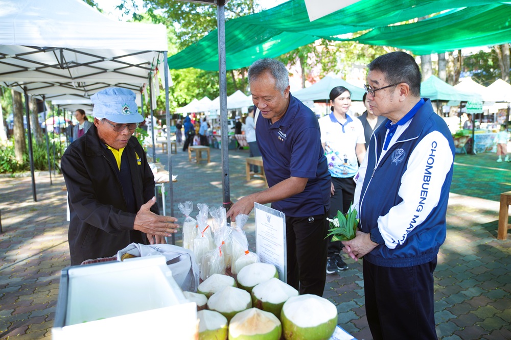 วันที่ 21 พฤศจิกายน 2568 ผู้ช่วยศาสตราจารย์อรรถพล อุสายพันธ์ รักษาราชการแทนอธิการบดี มหาวิทยาลัยราชภัฏหมู่บ้านจอมบึง ลงพื้นที่เยี่ยมชม “ตลาดเขียว ตลาดเกษตรแบ่งปัน” ซึ่งจัดขึ้นทุกวันเสาร์ ณ บริเวณลานชุ่มชื่น ภายในมหาวิทยาลัย