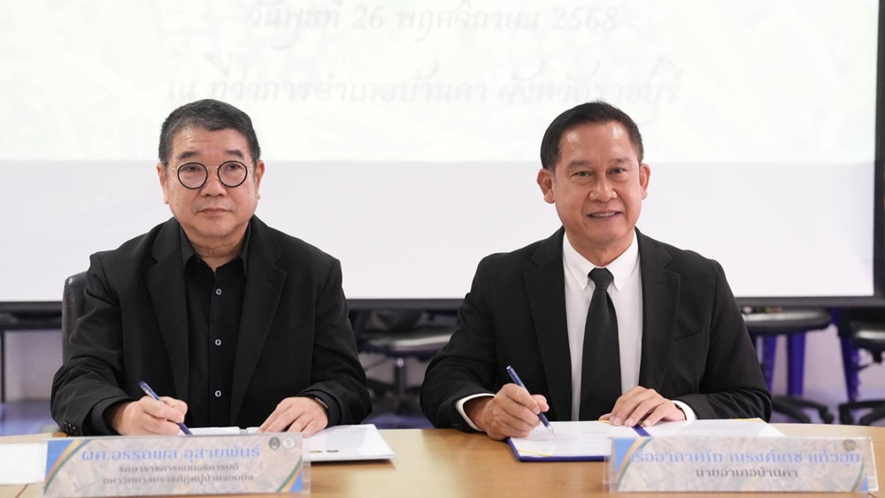 วันที่ 26 พฤศจิกายน 2568 ผู้ช่วยศาสตราจารย์อรรถพล อุสายพันธ์ รักษาราชการแทนอธิการบดีมหาวิทยาลัยราชภัฏหมู่บ้านจอมบึง เป็นประธานพิธี ลงนามบันทึกข้อตกลงความร่วมมือทางวิชาการ (MOU) เพื่อเสริมสร้างความเข้มแข็งของ ชุมชนสับปะรดต้นแบบอำเภอบ้านคา จังหวัดราชบุรี ณ ห้องประชุมที่ว่าการอำเภอบ้านคา