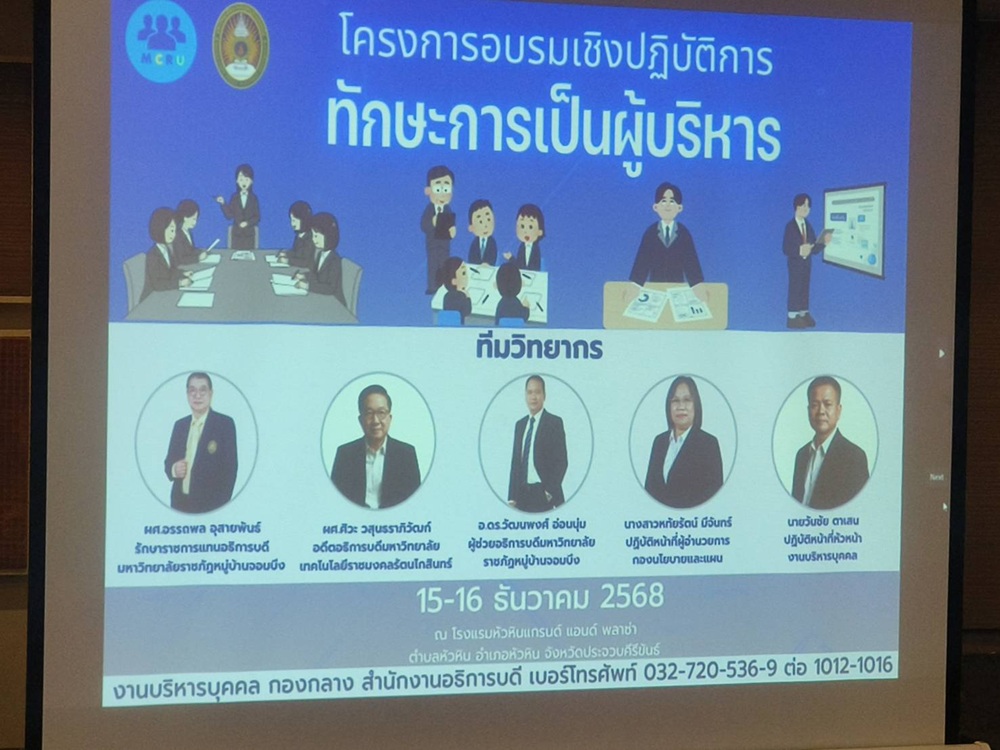 โครงการดังกล่าวจัดขึ้นระหว่างวันที่ 15–16 ธันวาคม 2568 ณ โรงแรมแกรนด์ แอนด์ พลาซ่า หัวหิน จังหวัดประจวบคีรีขันธ์ ซึ่งนับเป็นอีกหนึ่งกิจกรรมสำคัญที่ช่วยยกระดับขีดความสามารถของผู้บริหาร และสนับสนุนการขับเคลื่อนมหาวิทยาลัยสู่การพัฒนาอย่างยั่งยืน