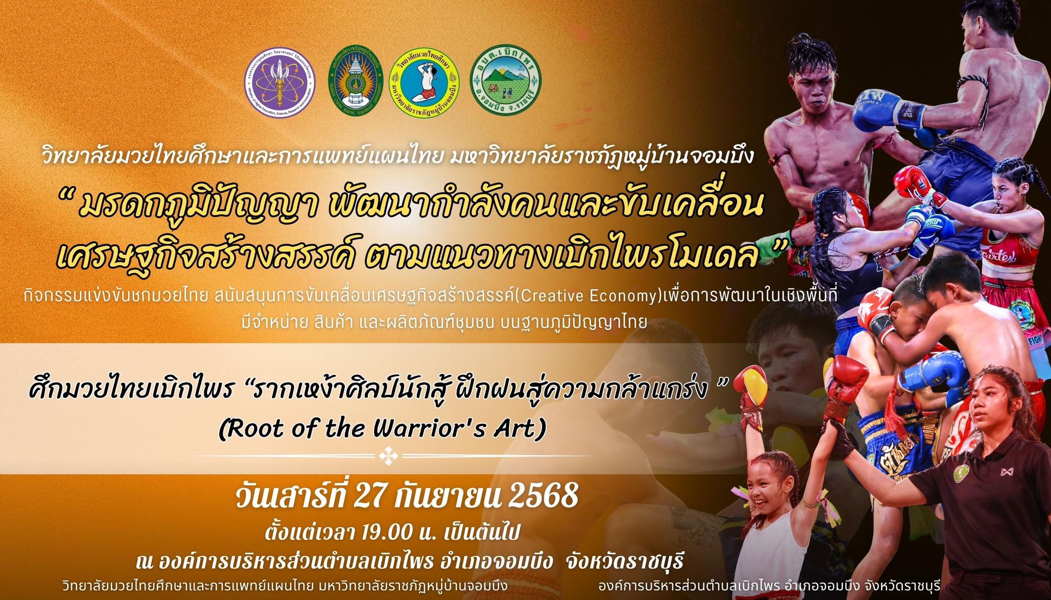 วิทยาลัยมวยไทยศึกษาและการแพทย์แผนไทยขอเรียนเชิญร่วมงาน "มรดรภูมิปัญญา พัฒนากำลังคนและขับเคลื่อนเศรษฐกิจสร้างสรรค์ ตามแนวทางเบิกไพรโมเดล" กิจกรรมการแข่งขันชกมวยไทยสนับสนุนการขับเคลื่อนเศรษฐกิจสร้างสรรค์ (Creative Economy) เพื่อการพัฒนาในเชิงพื้นที่ ศึกมวยไทยเบิกไพร " รากเหง้าศิลป์นักสู้ ฝึกฝนสู่ความกล้าแกร่ง" (Root Of the Warrior's Art) ในวันเสาร์ ที่ 27 กันยายน 2568 ตั้งแต่เวลา 19.00 น. เป็นต้นไป ณ องค์การบริหารส่วนตำบลเบิกไพร อำเภอจอมบึง จังหวัดราชบุรี