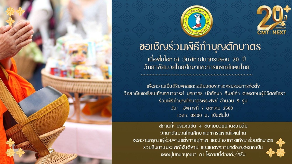 วิทยาลัยมวยไทยศึกษาและการแพทย์แผนไทยขอเชิญร่วมพิธีทำบุญตักบาตร เนื่องในโอกาส วันสถาปนาครบรอบ 20 ปี วิทยาลัยมวยไทยศึกษาและการแพทย์แผนไทย