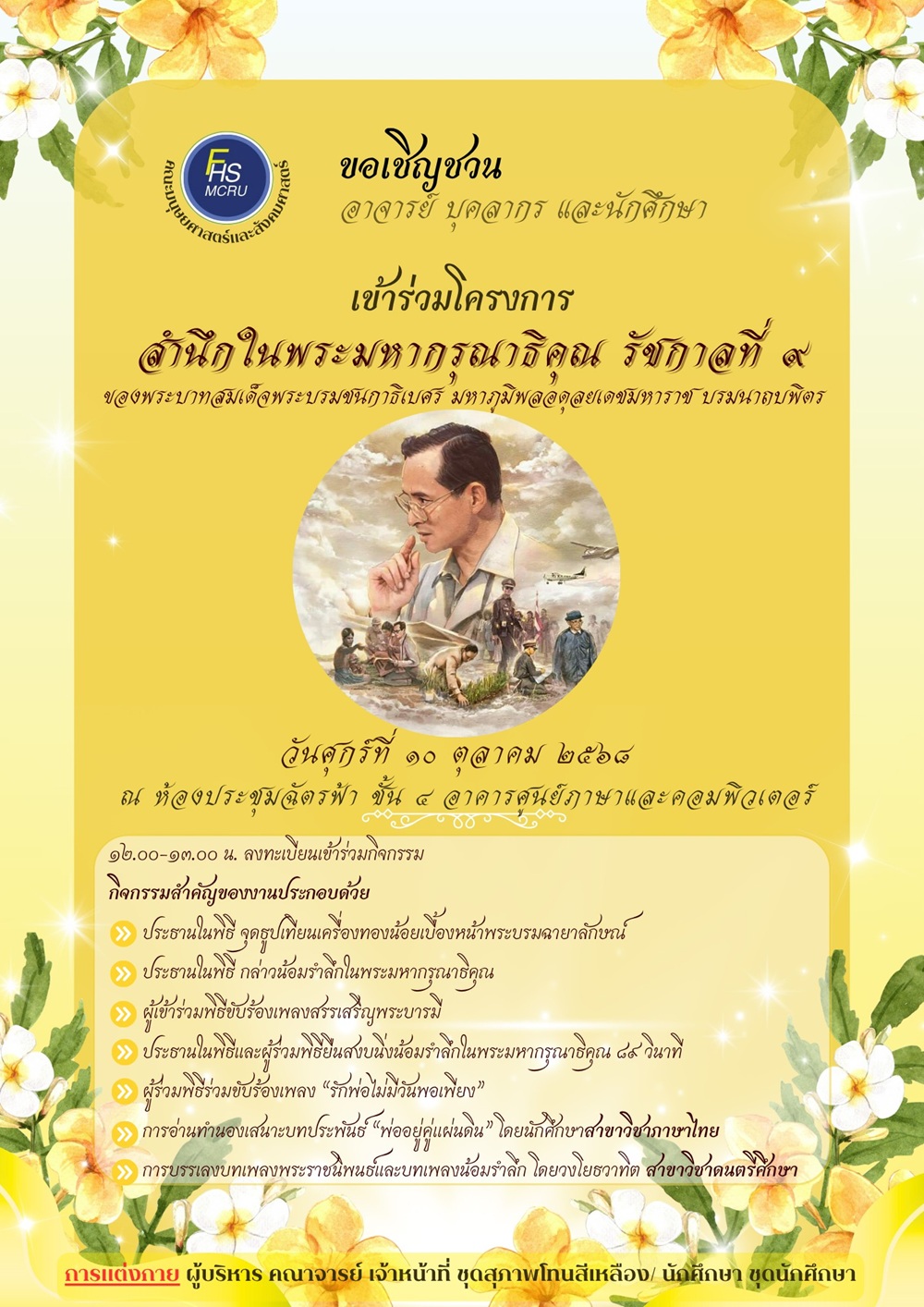 คณะมนุษยศาสตร์และสังคมศาสตร์ ขอเชิญร่วมกิจกรรม “สำนึกในพระมหากรุณาธิคุณ รัชกาลที่ ๙” เพื่อแสดงความจงรักภักดีและน้อมรำลึกในพระมหากรุณาธิคุณของในหลวงรัชกาลที่ ๙ ในวันศุกร์ที่ 10 ตุลาคม 2568 เริ่มเวลา 13.00 น. เป็นต้นไป ลานชุ่มชื่น คณะมนุษยศาสตร์และสังคมศาสตร์