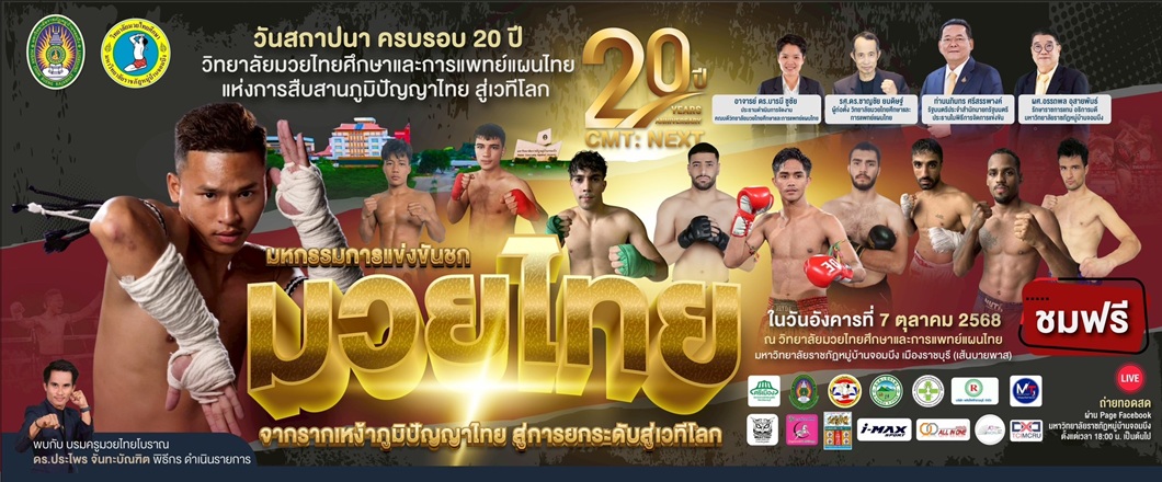 มหาวิทยาลัยราชภัฏหมู่บ้านจอมบึง ขอเชิญร่วมงานวันสถาปนาครบรอบ 20 ปี การก่อตั้งวิทยาลัยมวยไทยศึกษาและการแพทย์แผนไทย มหาวิทยาลัยราชภัฏหมู่บ้านจอมบึง ภายใต้แนวคิด“สถาบันแห่งเดียวของไทยที่ยกระดับมวยไทย และบูรณาการวิถีสุขภาพไทยสู่ระบบอุดมศึกษา”