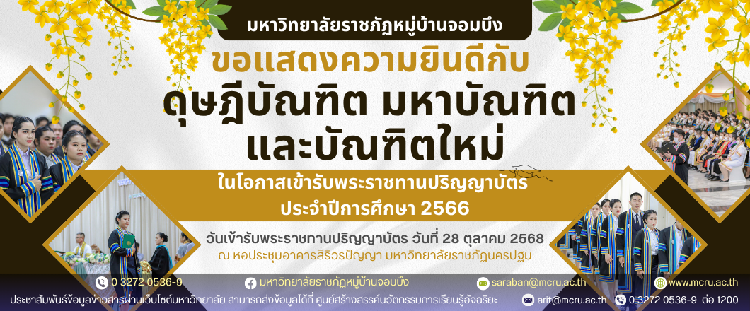 มหาวิทยาลัยราชภัฏหมู่บ้านจอมบึงขอแสดงความยินดีกับดุษฎีบัณฑิต มหาบัณฑิต และบัณฑิตใหม่ ในโอกาสเข้ารับพระราชทานปริญญาบัตร ประจำปีการศึกษา 2566 วันเข้ารับพระราชทานปริญญาบัตร วันที่ 28 ตุลาคม 2568 ณ หอประชุมอาคารสิริวรปัญญา มหาวิทยาลัยราชภัฏนครปฐม