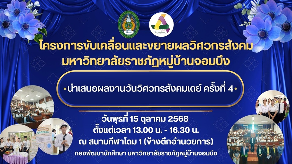 กองพัฒนานักศึกษา มหาวิทยาลัยราชภัฏหมู่บ้านจอมบึง ขอเชิญนักศึกษา คณาจารย์ และผู้สนใจทุกท่าน ร่วมกิจกรรม โครงการขับเคลื่อนและขยายผลวิศวกรสังคม นำเสนอผลงานในงาน “วันวิศวกรสังคมเดย์ ครั้งที่ 4” เวทีแสดงผลงานนวัตกรรมเพื่อสังคม ที่รวบรวมไอเดียสุดสร้างสรรค์จากนักวิศวกรสังคมรุ่นใหม่ ภายใต้แนวคิด “เปลี่ยนชุมชน ด้วยนวัตกรรมของเรา”