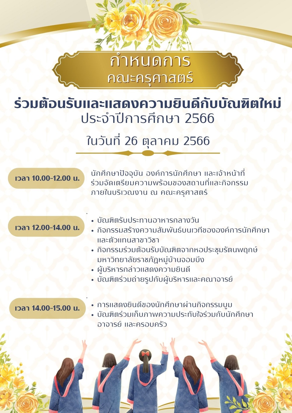 ขอเชิญคณาจารย์ บุคลากร นักศึกษา และบัณฑิตใหม่ร่วมกิจกรรมต้อนรับและแสดงความยินดีกับบัณฑิตใหม่ ประจำปีการศึกษา 2566