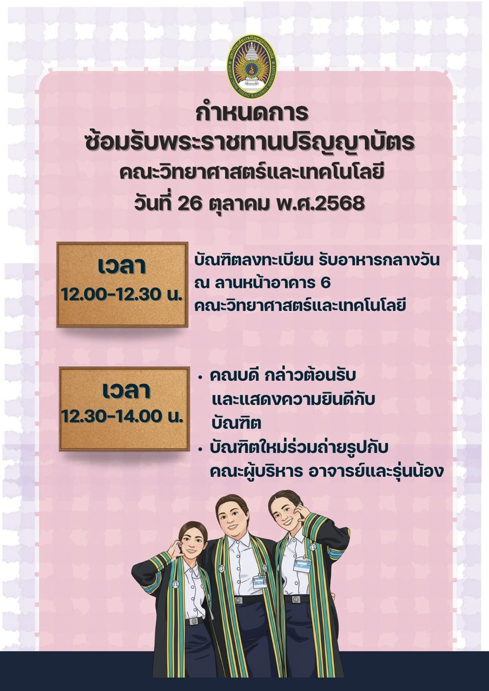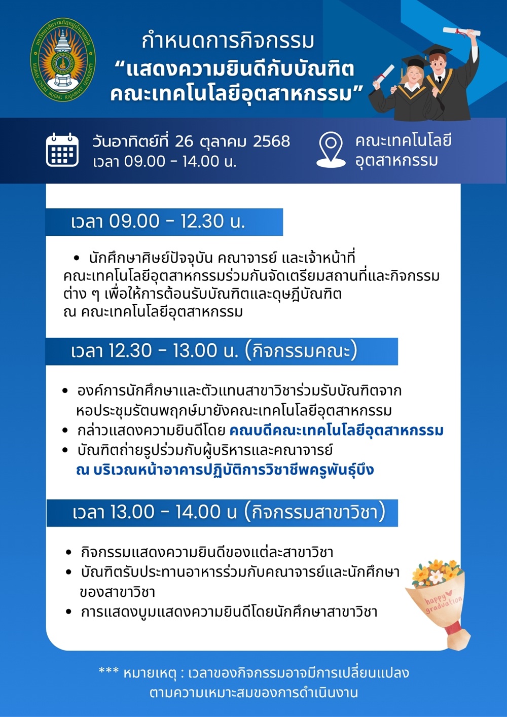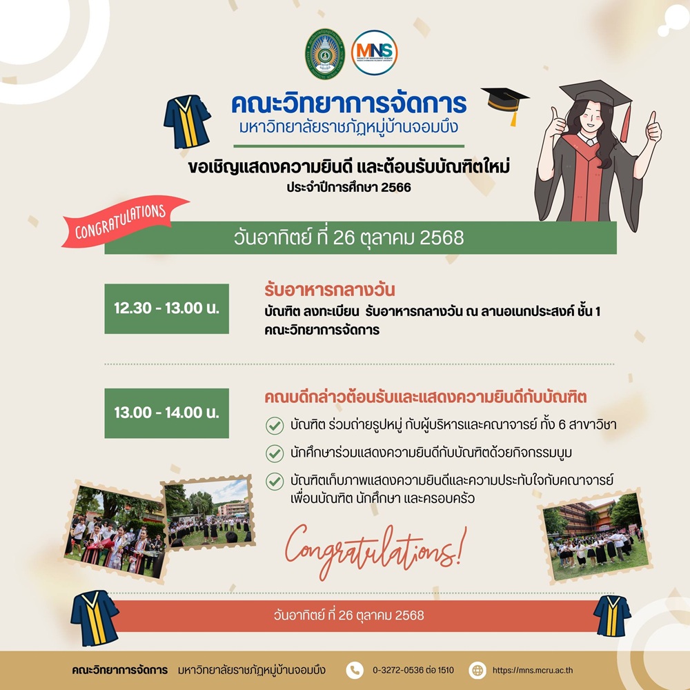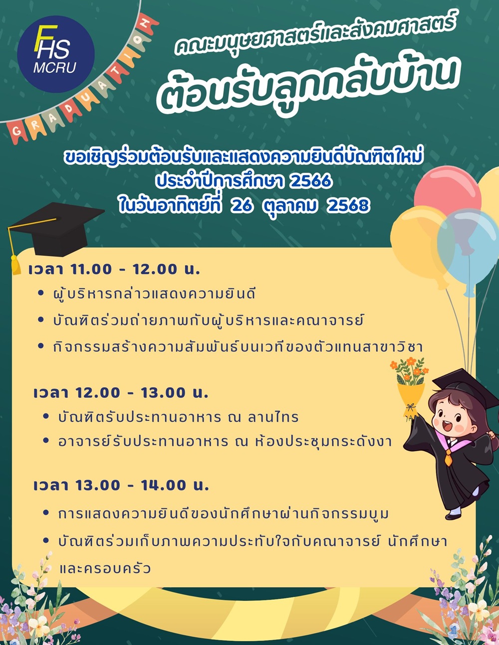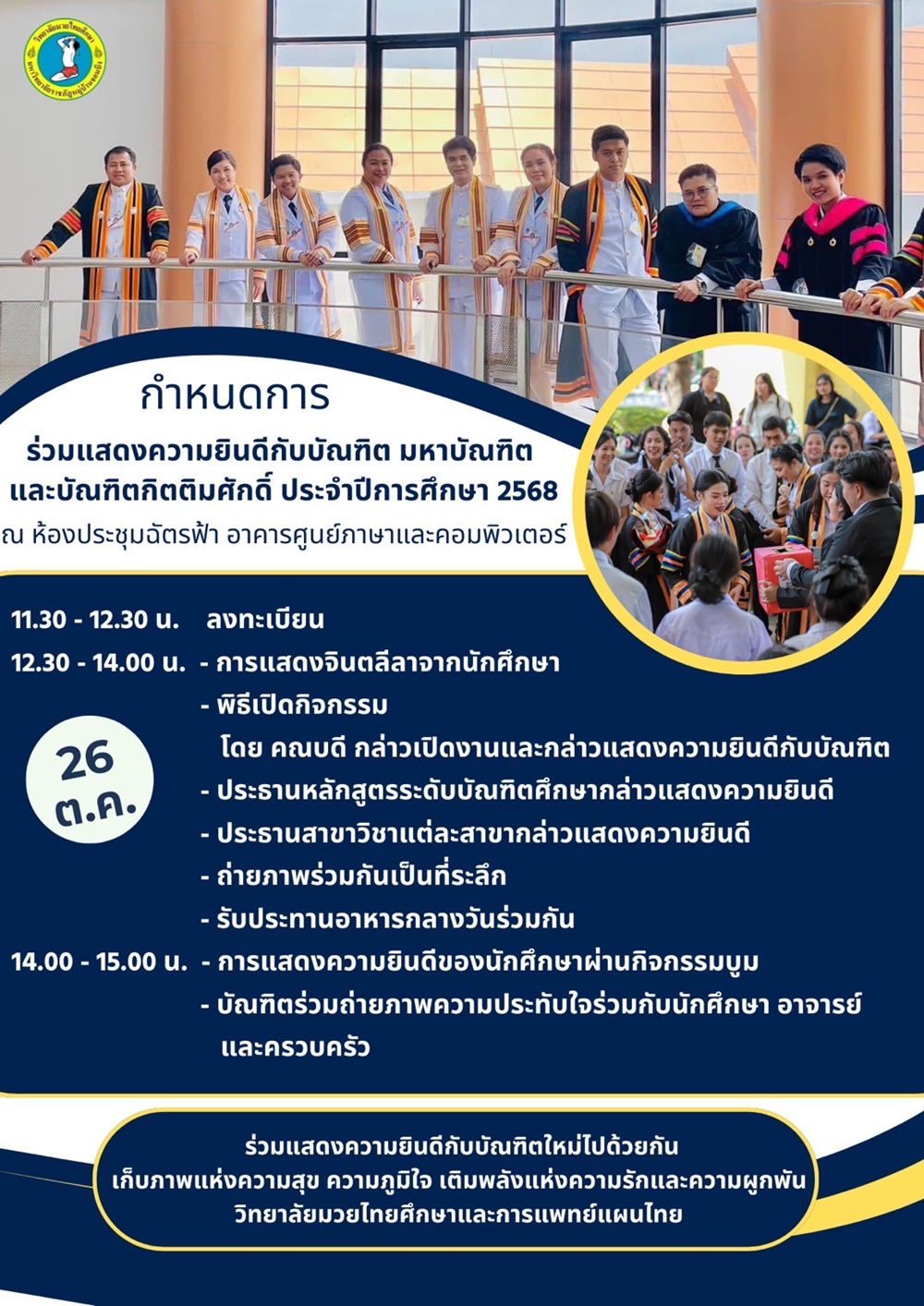 กำหนดจัดกิจกรรม “ต้อนรับและแสดงความยินดีกับบัณฑิตใหม่ ประจำปีการศึกษา 2566” ในวัน อาทิตย์ที่ 26 ตุลาคม 2568 เพื่อร่วมแสดงความยินดีกับบัณฑิตทุกคนในโอกาสแห่งความสำเร็จและความภาคภูมิใจของชีวิต