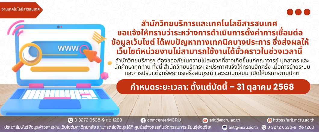 งานเทคโนโลยีสารสนเทศ สำนักวิทยบริการและเทคโนโลยีสารสนเทศ ขอแจ้งให้ทราบว่าระหว่างการดำเนินการตั้งค่าการเชื่อมต่อข้อมูลเว็บไซต์ ได้พบปัญหาทางเทคนิคบางประการ ซึ่งส่งผลให้เว็บไซต์หน่วยงานไม่สามารถใช้งานได้ชั่วคราวในช่วงเวลานี้