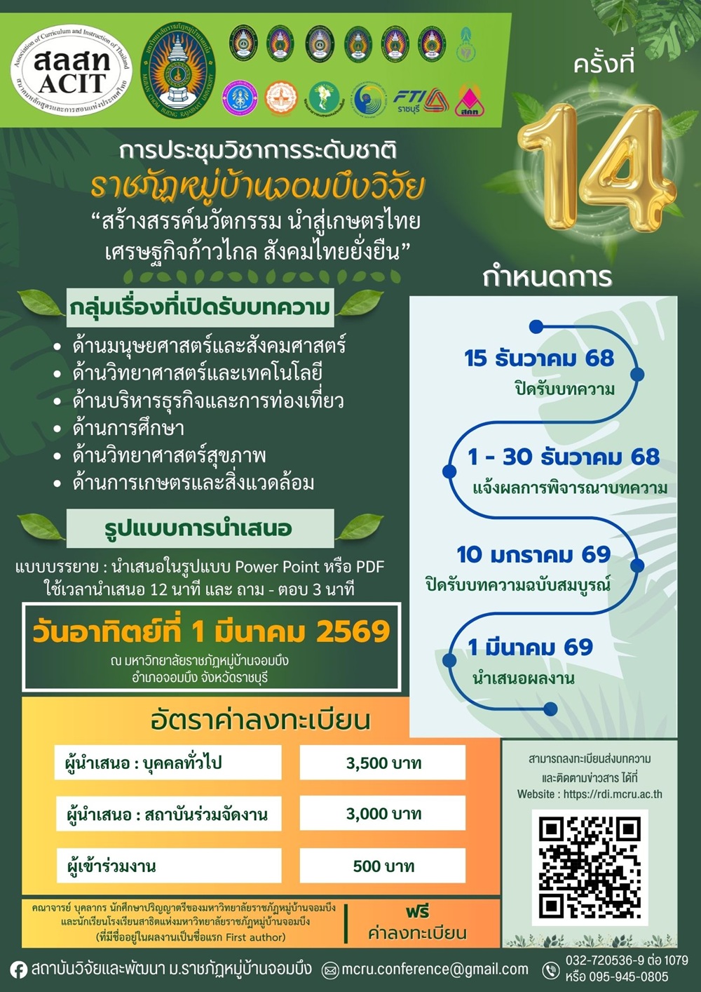 มหาวิทยาลัยราชภัฏหมู่บ้านจอมบึง ขอเชิญส่งบทความวิจัยและบทความวิชาการ ในการประชุมวิชาการระดับชาติราชภัฏหมู่บ้านจอมบึงวิจัย ครั้งที่ 14 “สร้างสรรค์นวัตกรรม นำสู่เกษตรไทย เศรษฐกิจก้าวไกล สังคมไทยยั่งยืน”