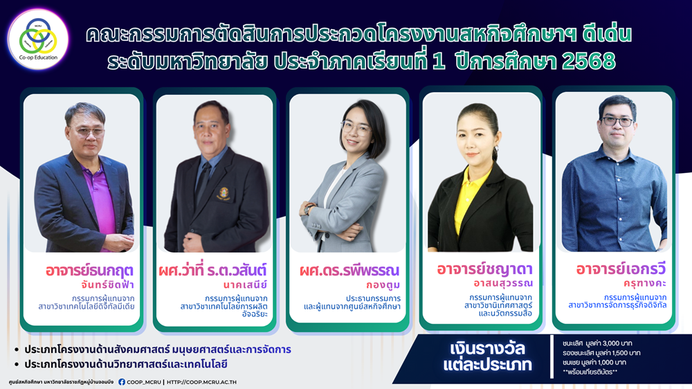 ✅ การประกวดโครงงานสหกิจศึกษาดีเด่น ระดับมหาวิทยาลัย ประจำภาคเรียนที่ 1 ปีการศึกษา 2568 โดยแบ่งออกเป็น 2 ประเภท ได้แก่