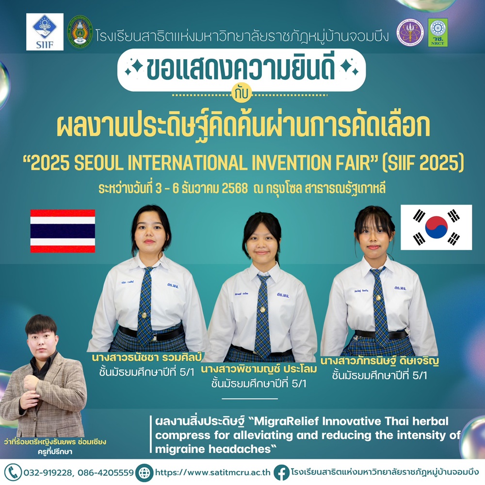 มหาวิทยาลัยราชภัฏหมู่บ้านจอมบึงขอแสดงความยินดีกับ ผลงานสิ่งประดิษฐ์คิดค้นที่ผ่านการคัดเลือกเข้าร่วมเวทีระดับโลก ในงาน “2025 Seoul International Invention Fair” (SIIF 2025) ของนักเรียนโรงเรียนสาธิตฯ