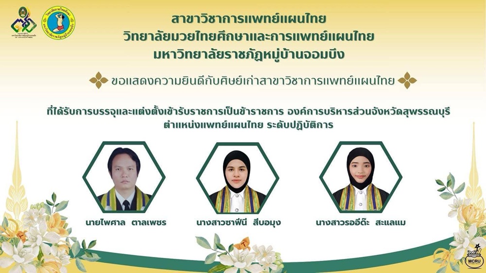 มหาวิทยาลัยราชภัฏหมู่บ้านจอมบึง ขอแสดงความยินดีกับ ศิษย์เก่าสาขาวิชาการแพทย์แผนไทย ในโอกาสที่ได้รับการ บรรจุแต่งตั้งเป็นข้าราชการองค์การบริหารส่วนจังหวัดสุพรรณบุรี ในตำแหน่ง แพทย์แผนไทยปฏิบัติการ