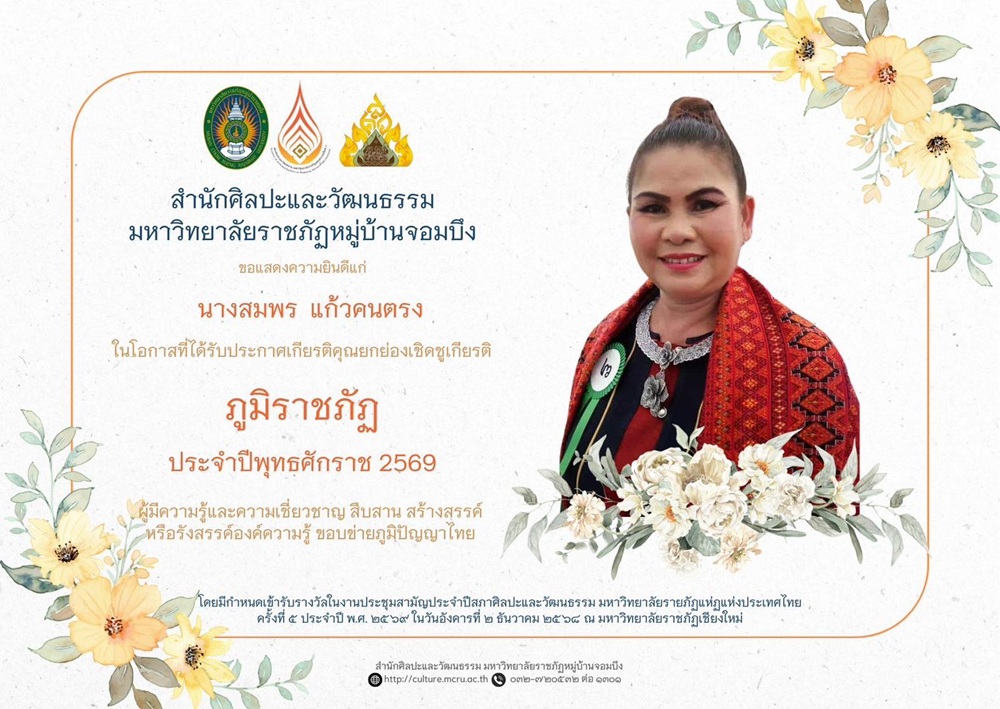 มหาวิทยาลัยราชภัฏหมู่บ้านจอมบึง ขอแสดงความยินดีกับ “นางสมพร แก้วคนตรง” ผู้สืบสานภูมิปัญญาไทย ได้รับรางวัล “ภูมิราชภัฏ” ประจำปี 2569