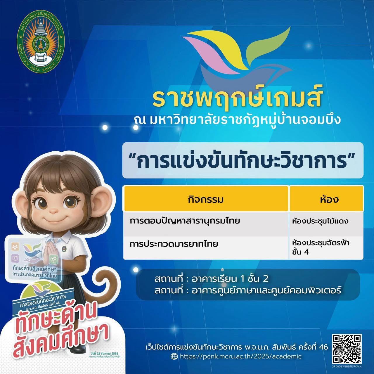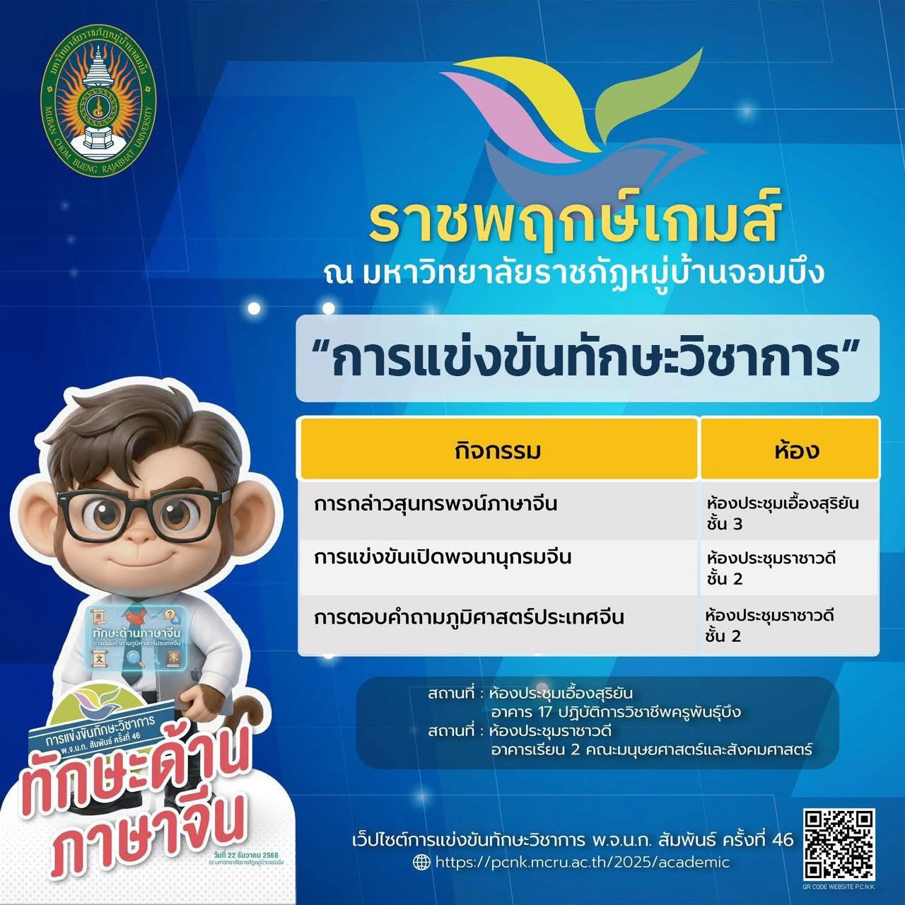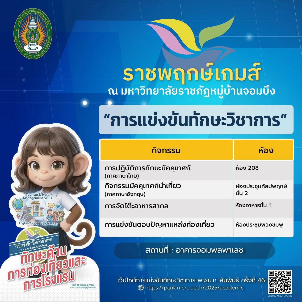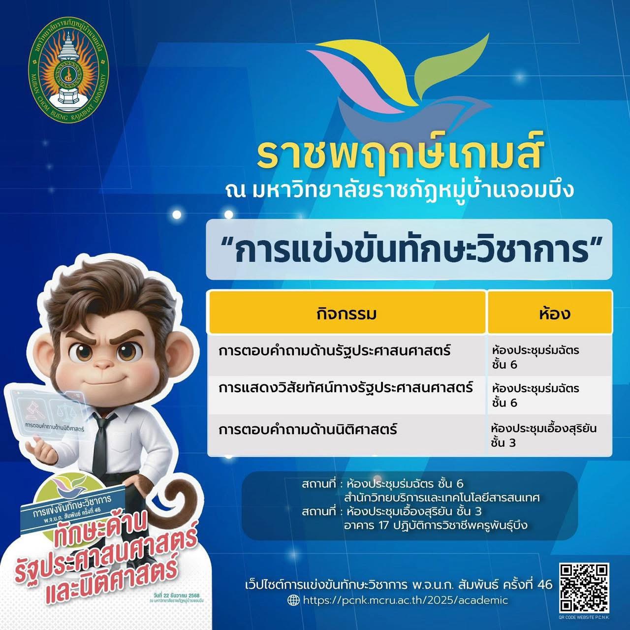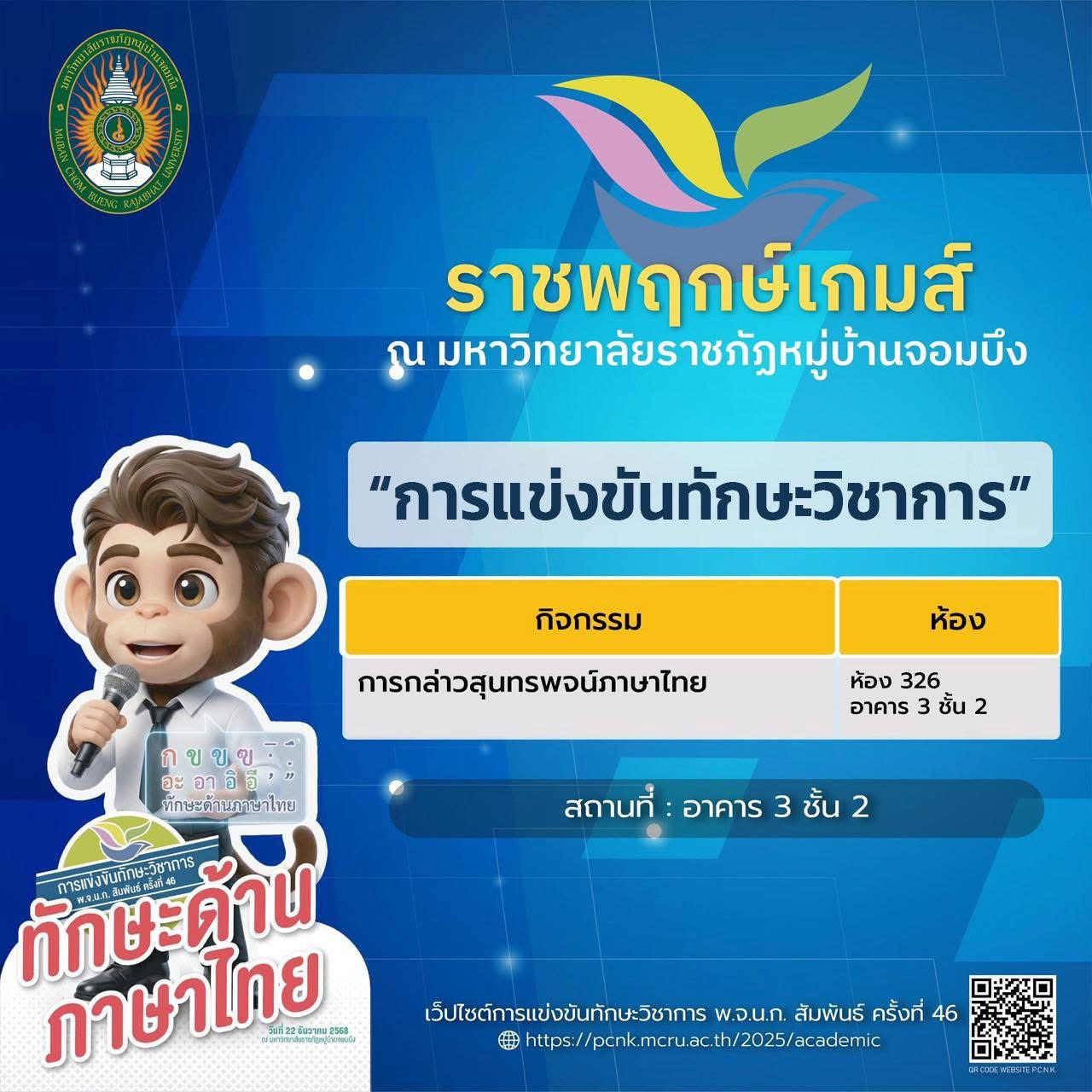มหาวิทยาลัยราชภัฏหมู่บ้านจอมบึง ขอเชิญร่วมเป็นส่วนหนึ่งของบรรยากาศแห่งพลัง ความสามารถ และความภาคภูมิใจ กับ การแข่งขันทักษะวิชาการ พ.จ.น.ก. สัมพันธ์ ครั้งที่ 46 ภายใต้ชื่อ “ราชพฤกษ์เกมส์”
