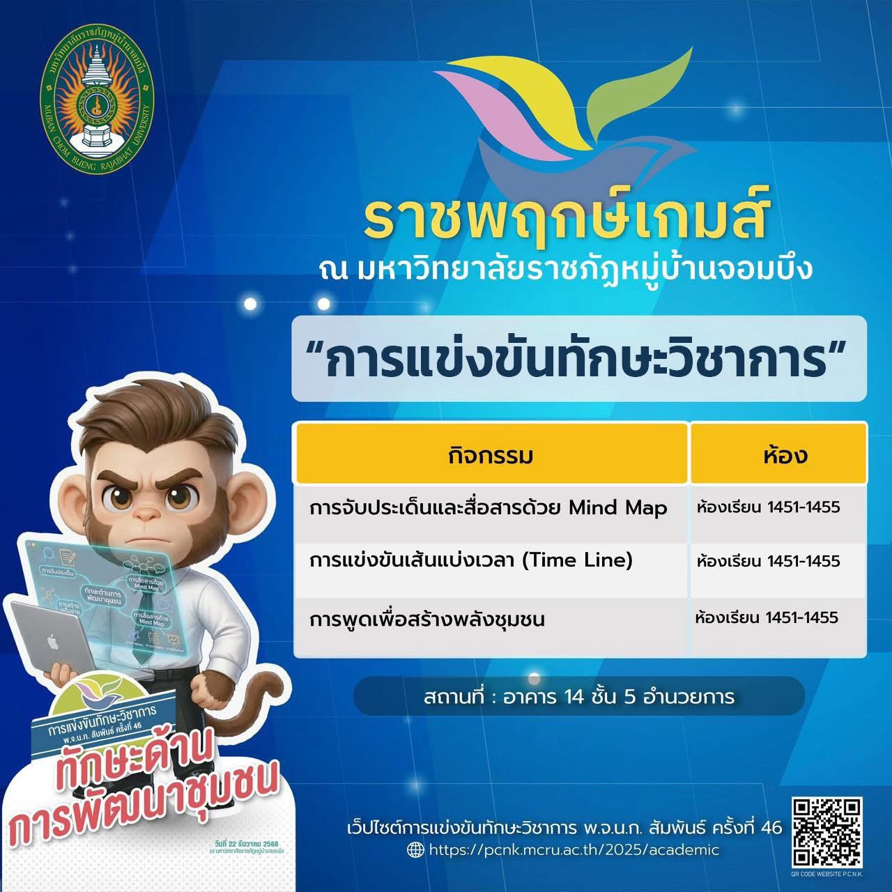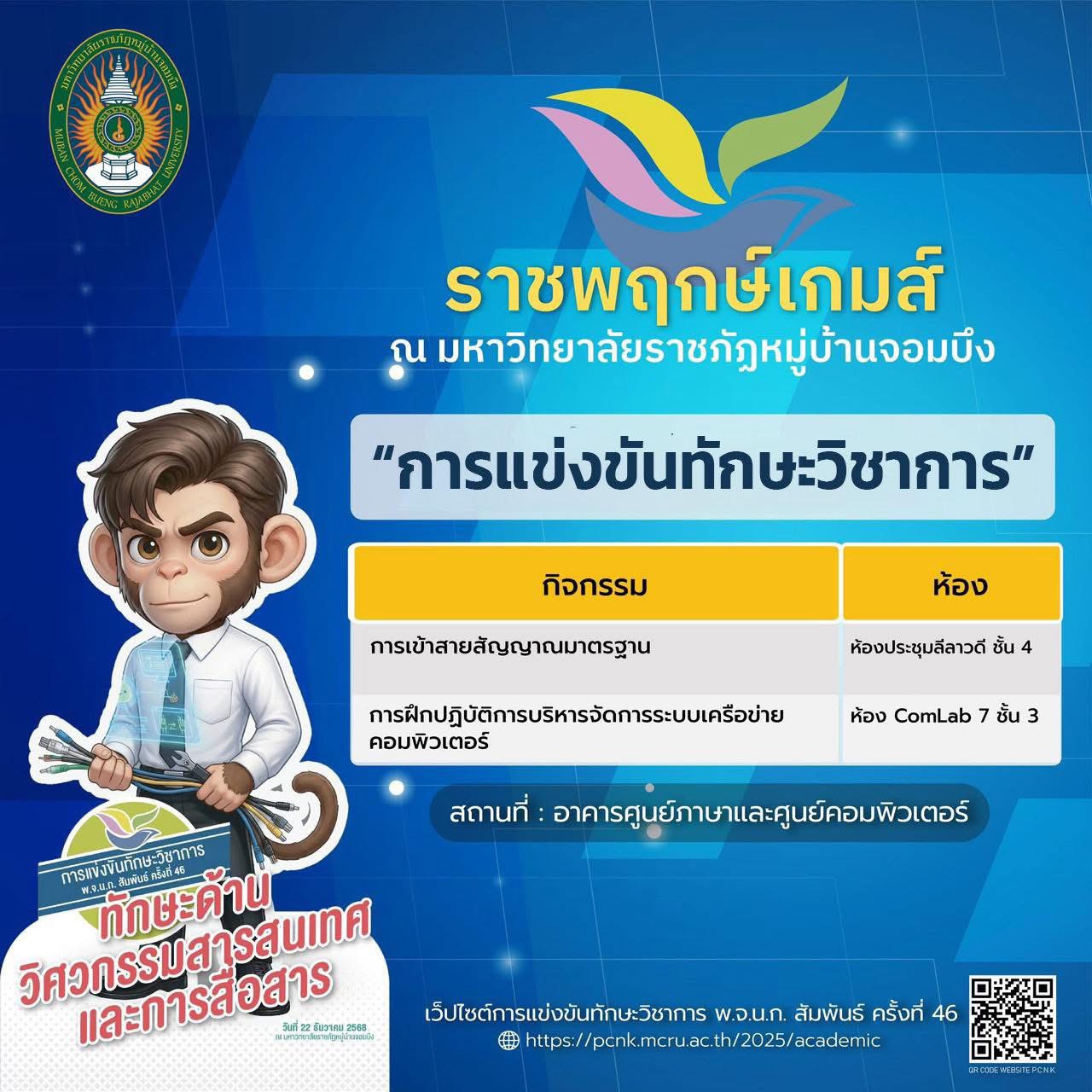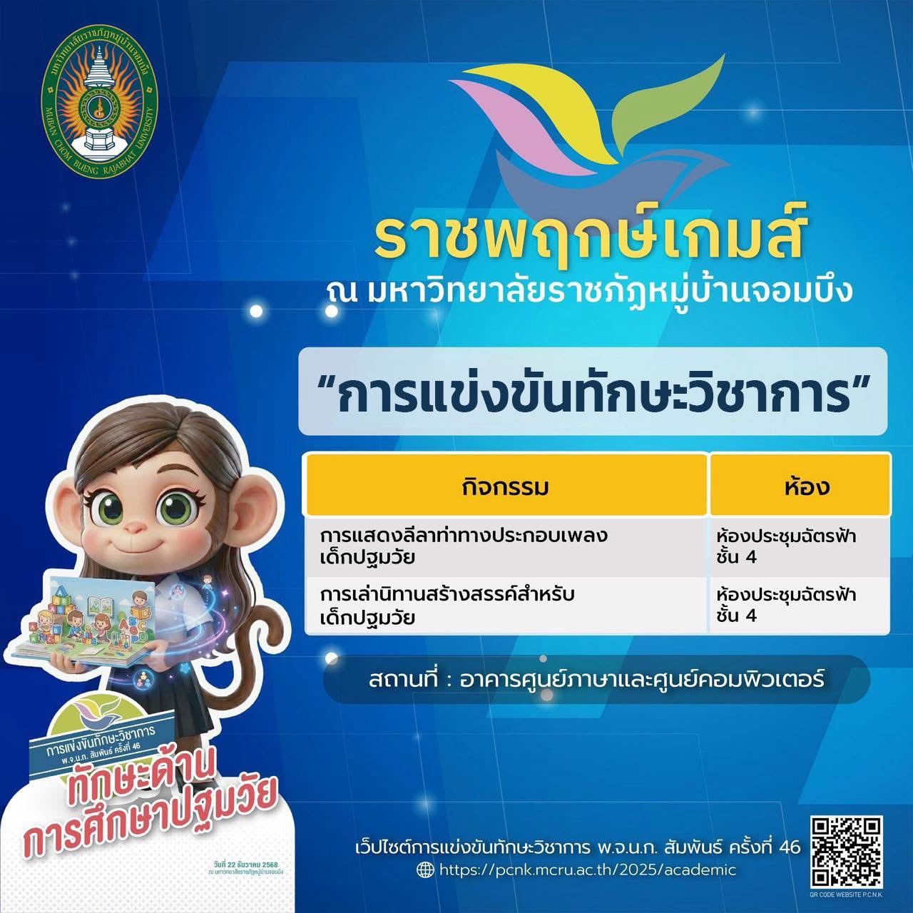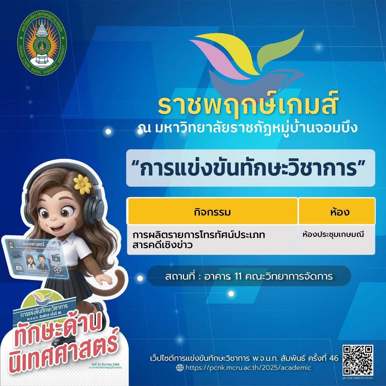 มหาวิทยาลัยราชภัฏหมู่บ้านจอมบึง ขอเชิญร่วมเป็นส่วนหนึ่งของบรรยากาศแห่งพลัง ความสามารถ และความภาคภูมิใจ กับ การแข่งขันทักษะวิชาการ พ.จ.น.ก. สัมพันธ์ ครั้งที่ 46 ภายใต้ชื่อ “ราชพฤกษ์เกมส์”