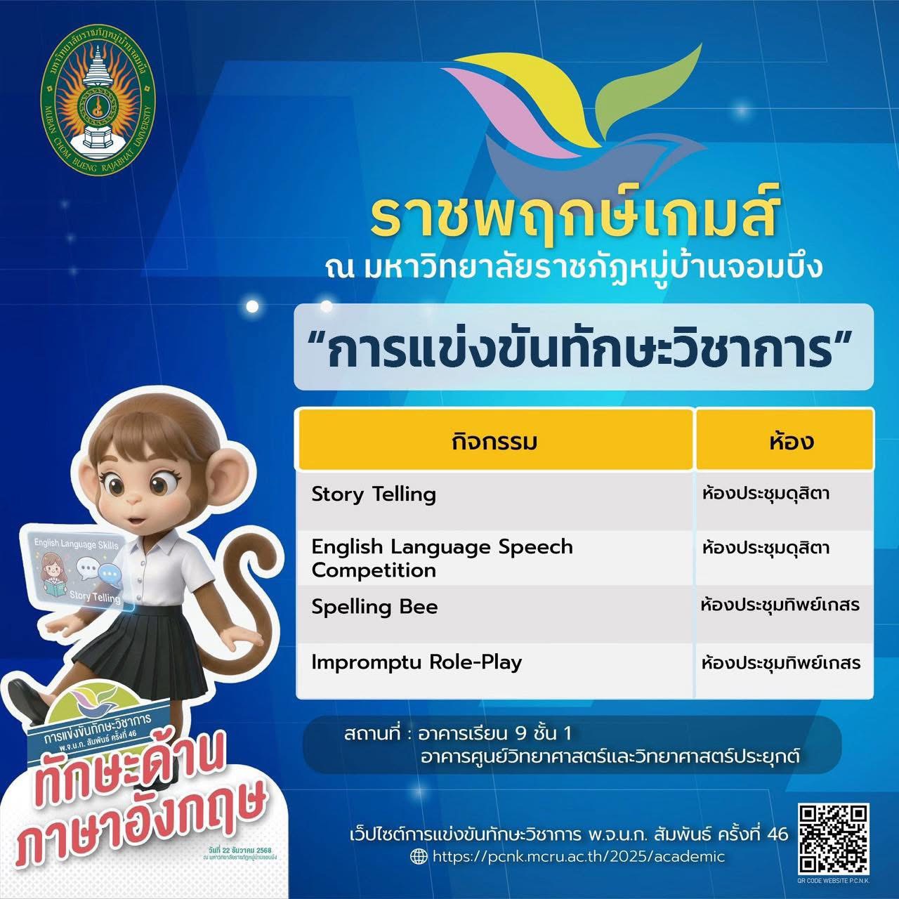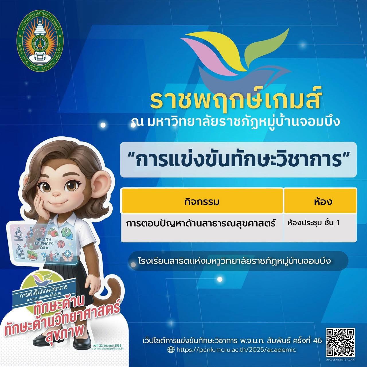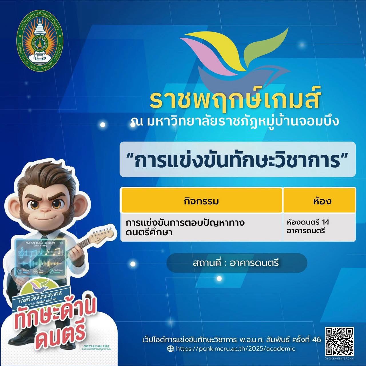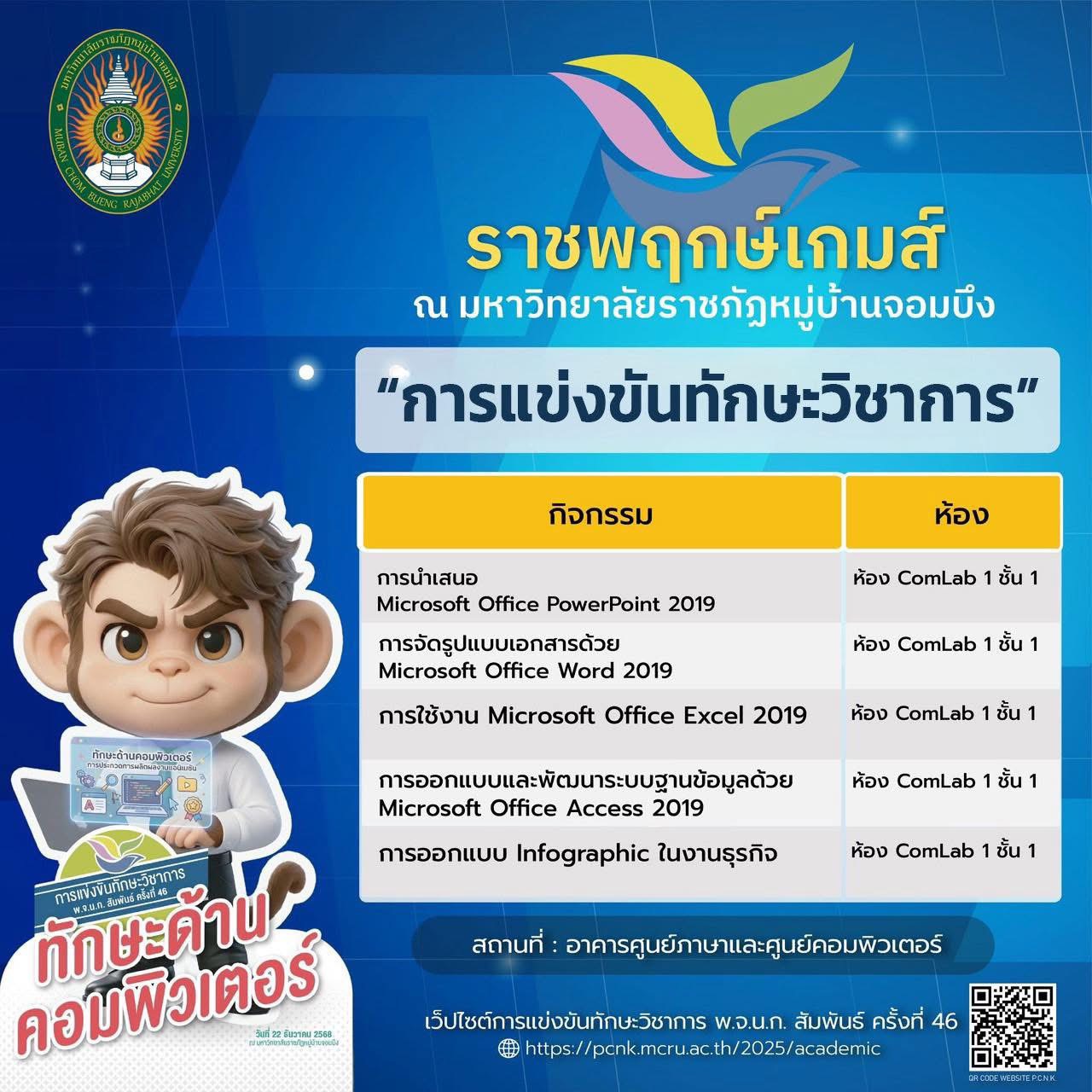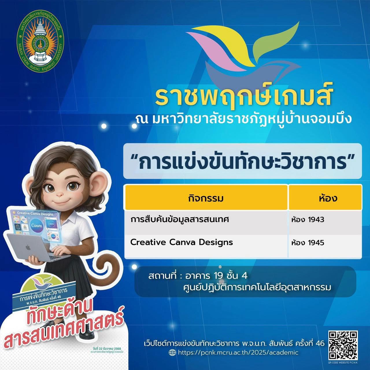 มหาวิทยาลัยราชภัฏหมู่บ้านจอมบึง ขอเชิญร่วมเป็นส่วนหนึ่งของบรรยากาศแห่งพลัง ความสามารถ และความภาคภูมิใจ กับ การแข่งขันทักษะวิชาการ พ.จ.น.ก. สัมพันธ์ ครั้งที่ 46 ภายใต้ชื่อ “ราชพฤกษ์เกมส์”