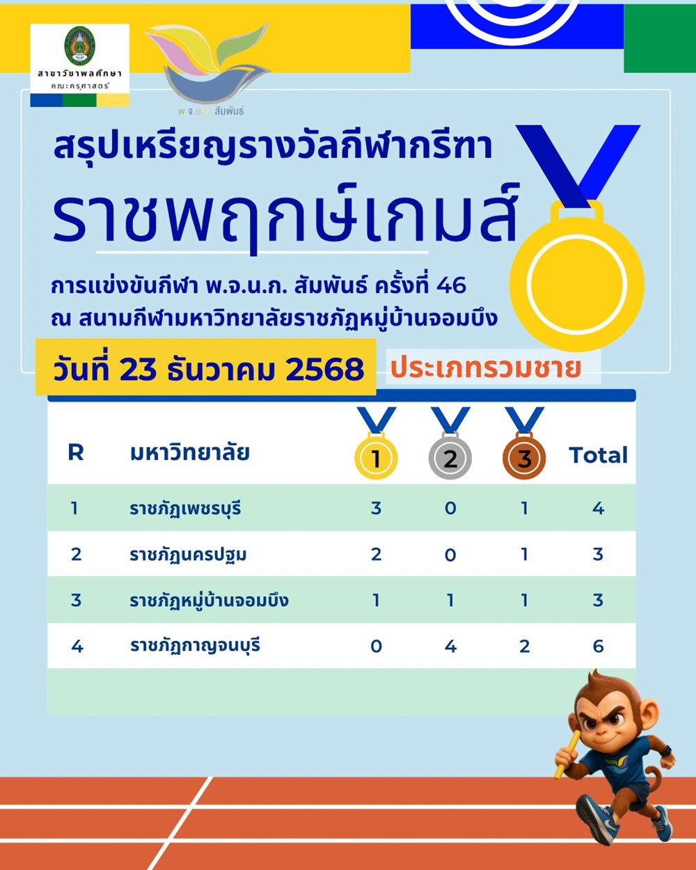 มหาวิทยาลัยราชภัฏหมู่บ้านจอมบึง ขอประชาสัมพันธ์ผลการแข่งขัน กรีฑา ภายใต้การแข่งขันกีฬา พ.จ.น.ก.สัมพันธ์ ครั้งที่ 46 “ราชพฤกษ์เกมส์” ซึ่งจัดขึ้นเมื่อวันที่ 23 ธันวาคม พ.ศ. 2568 ณ สนามกีฬามหาวิทยาลัยราชภัฏหมู่บ้านจอมบึง