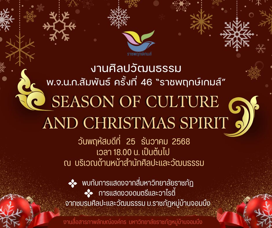 มหาวิทยาลัยราชภัฏหมู่บ้านจอมบึง ขอเชิญชวนผู้บริหาร คณาจารย์ บุคลากร นักศึกษา และประชาชนทั่วไป ร่วมสัมผัสบรรยากาศแห่งความสุขในงาน ศิลปวัฒนธรรม พ.จ.น.ก.สัมพันธ์ ครั้งที่ 46 “ราชพฤกษ์เกมส์” ภายใต้แนวคิด 🎄 Season of Culture and Christmas Spirit 🎄