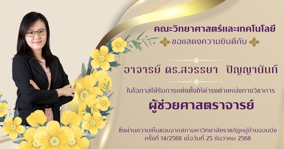 มหาวิทยาลัยราชภัฏหมู่บ้านจอมบึง ขอแสดงความยินดีอย่างยิ่งกับ อาจารย์ ดร.สวรรยา ปัญญานันท์ อาจารย์ประจำสาขาวิชาเทคโนโลยีการแปรรูปอาหาร ในโอกาสได้รับการแต่งตั้งให้ดำรงตำแหน่งทางวิชาการ “ผู้ช่วยศาสตราจารย์” ด้รับความเห็นชอบจาก สภามหาวิทยาลัยราชภัฏหมู่บ้านจอมบึง ในการประชุมครั้งที่ 14/2568 เมื่อวันที่ 25 ธันวาคม 2568