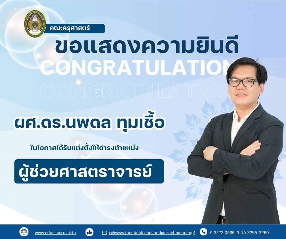 มหาวิทยาลัยราชภัฏหมู่บ้านจอมบึง ขอแสดงความยินดีกับอาจารย์ ดร.นพดล ทุมเชื้อ ผู้อำนวยการโรงเรียนสาธิตแห่งมหาวิทยาลัยราชภัฏหมู่บ้านจอมบึง ในโอกาสได้รับการแต่งตั้งให้ดำรงตำแหน่งทางวิชาการ “ผู้ช่วยศาสตราจารย์”
