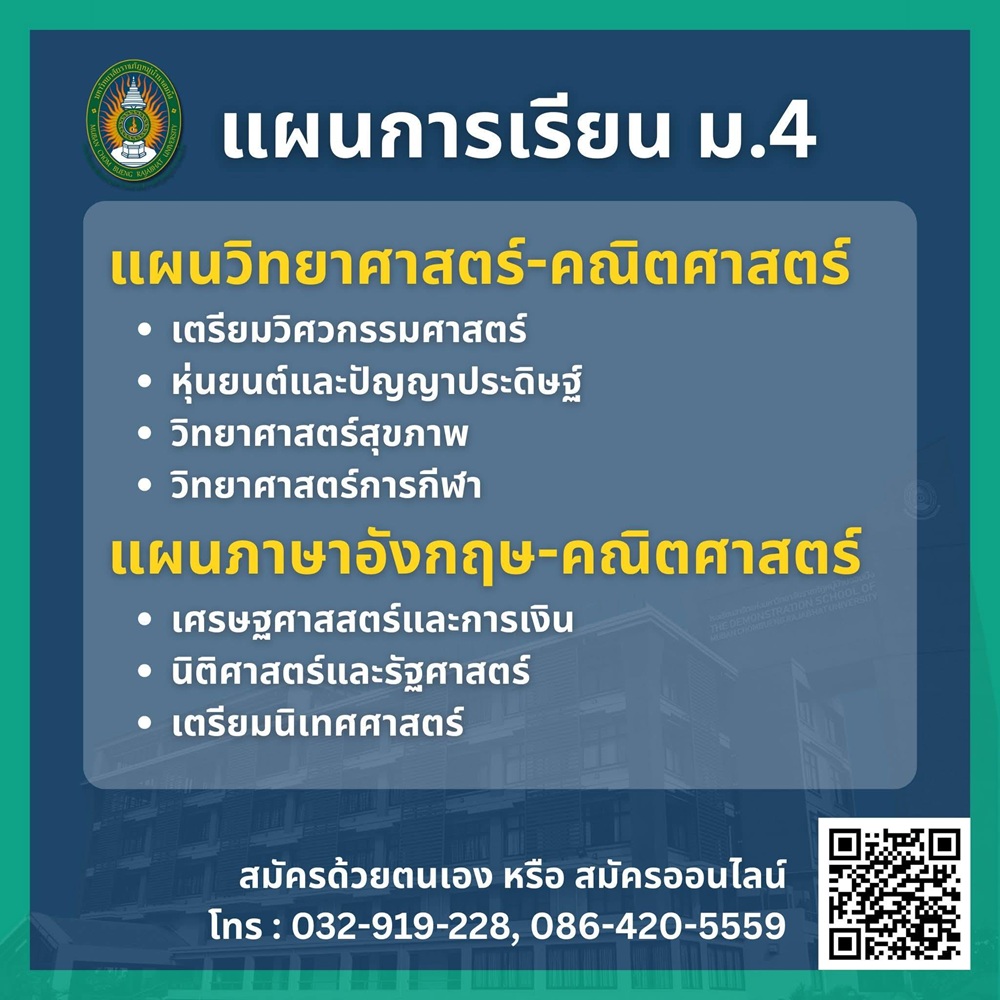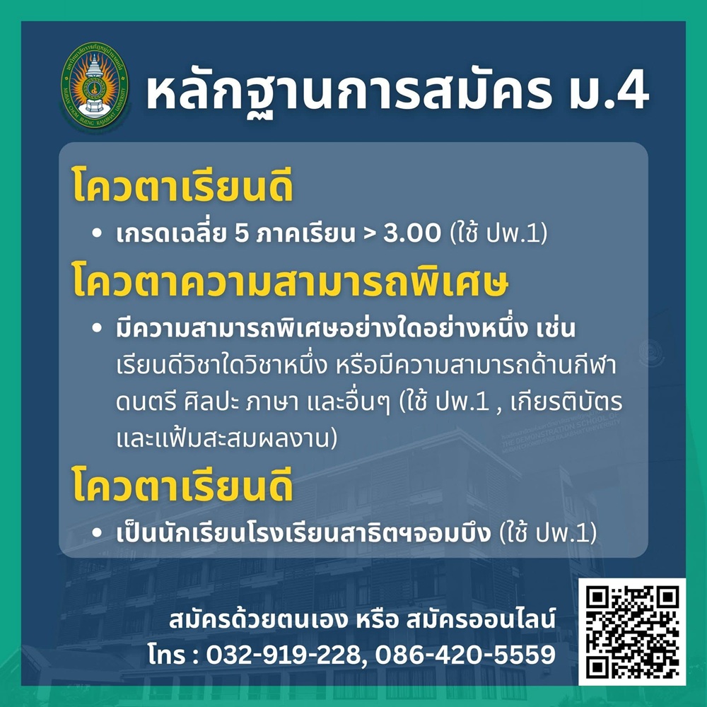 ทั้งนี้ โรงเรียนได้จัดเตรียมรายละเอียด แผนการเรียน คุณสมบัติผู้สมัคร เกณฑ์การสอบสัมภาษณ์และการทดสอบความสามารถ รวมถึงกำหนดการรับสมัคร ไว้อย่างครบถ้วน เพื่ออำนวยความสะดวกแก่ผู้ปกครองและนักเรียนที่สนใจสมัครเข้าศึกษาต่อ