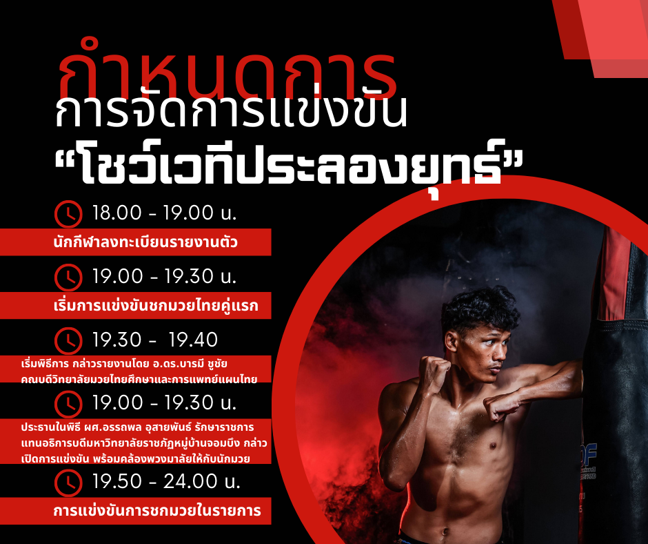 มหาวิทยาลัยราชภัฏหมู่บ้านจอมบึง โดยวิทยาลัยมวยไทยศึกษาและการแพทย์แผนไทย จัดกิจกรรมการแข่งขันชกมวยไทยรายการ “โชว์เอทประลองยุทธ์” ภายใต้โครงการ ต้นกล้ามวยไทยสร้างสุข ยกระดับชุมชน ปั้น Soft Power เพื่อส่งเสริมศิลปวัฒนธรรมมวยไทยสู่สากล ควบคู่กับการพัฒนาศักยภาพเยาวชนและเศรษฐกิจชุมชน