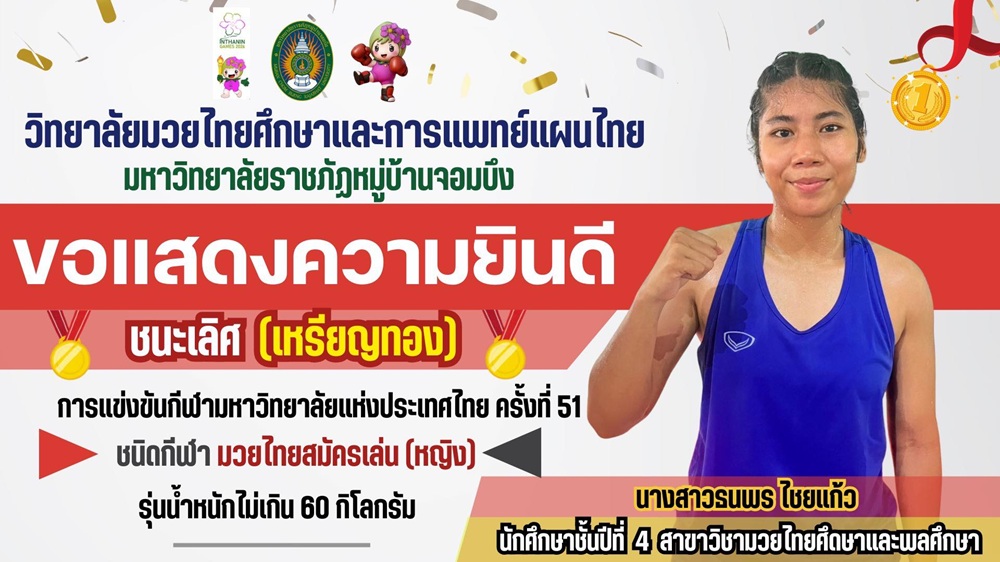 ขอแสดงความยินดีกับ นางสาวธนพร ไชยแก้ว นักศึกษาชั้นปีที่ 4 การแข่งขันมวยไทยสมัครเล่นหญิง กีฬามหาวิทยาลัย รุ่นน้ำหนักไม่เกิน 60 กิโลกรัม นับเป็นผลงานที่สะท้อนถึงความมุ่งมั่น ความทุ่มเท และหัวใจนักสู้ สร้างชื่อเสียงและความภาคภูมิใจให้แก่มหาวิทยาลัยอย่างยิ่ง