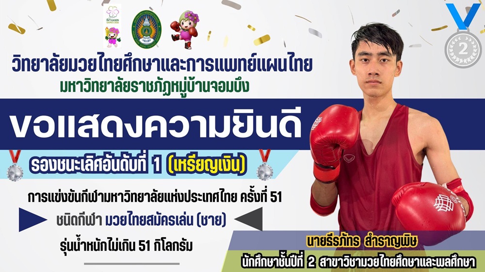 มหาวิทยาลัยราชภัฏหมู่บ้านจอมบึง ขอแสดงความยินดีและความภาคภูมิใจกับ ทีมมวยไทยสมัครเล่น มหาวิทยาลัยราชภัฏหมู่บ้านจอมบึง ที่เข้าร่วมการแข่งขัน มวยไทยสมัครเล่น ในกีฬามหาวิทยาลัยแห่งประเทศไทย ครั้งที่ 51 “อินทนิลเกมส์ 2026” และสามารถแสดงศักยภาพบนสังเวียนได้อย่างยอดเยี่ยม ด้วยหัวใจนักสู้ สปิริตแห่งความเป็นนักกีฬา และความมุ่งมั่นทุ่มเท จนสร้างผลงานความสำเร็จอันน่าภาคภูมิใจให้กับสถาบันและชาวจอมบึงทุกคน
