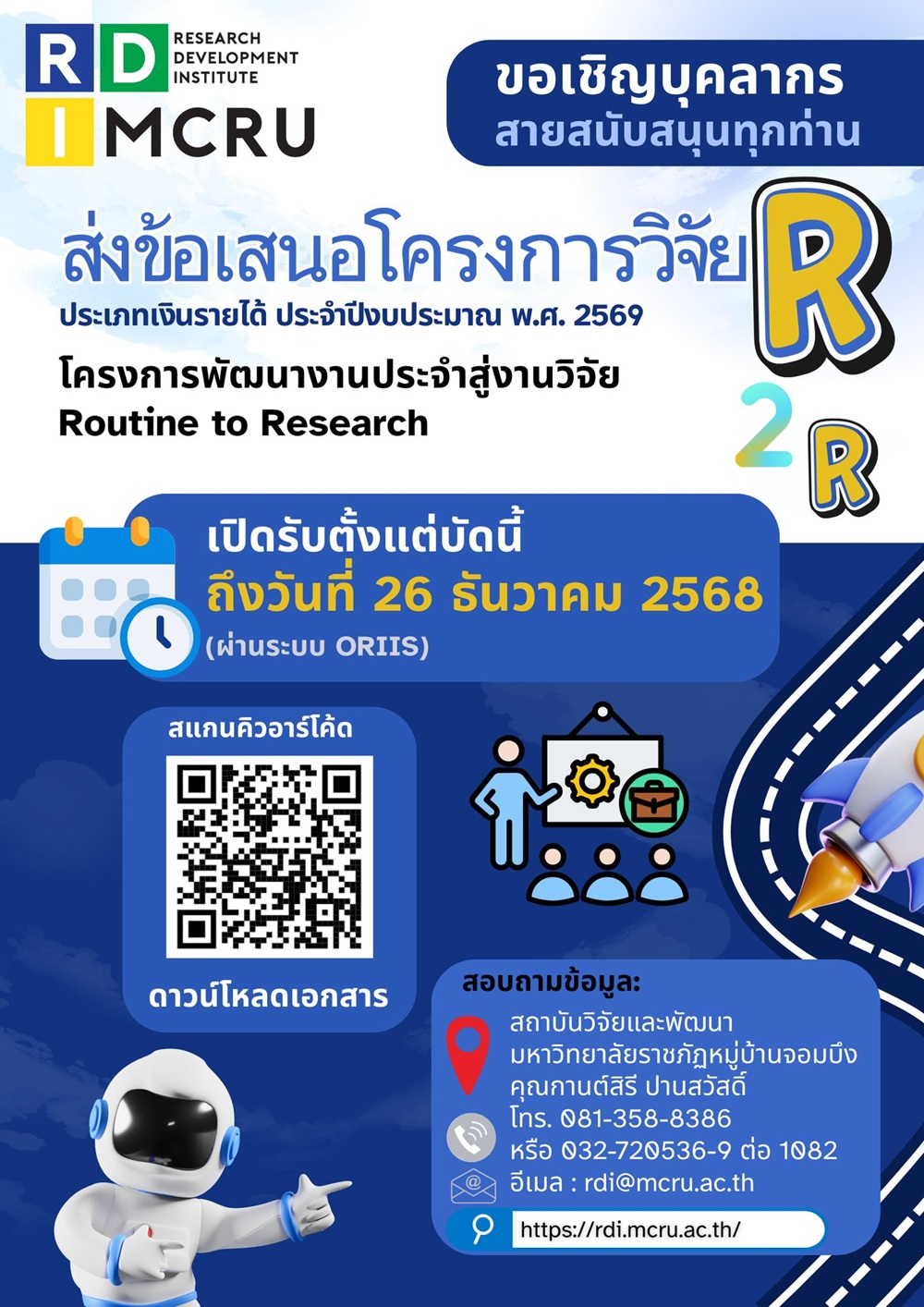 สถาบันวิจัยและพัฒนา มหาวิทยาลัยราชภัฏหมู่บ้านจอมบึง ขอเชิญ บุคลากรสายสนับสนุน ร่วมส่ง ข้อเสนอโครงการวิจัย ประเภทเงินรายได้ ประจำปีงบประมาณ พ.ศ. 2569 ภายใต้ โครงการพัฒนางานประจำสู่งานวิจัย (R to R : Routine to Research) เพื่อส่งเสริมการพัฒนางานประจำให้เกิดองค์ความรู้เชิงวิจัย สามารถนำไปใช้ปรับปรุงกระบวนการทำงาน เพิ่มประสิทธิภาพ และยกระดับคุณภาพการให้บริการของมหาวิทยาลัยอย่างเป็นรูปธรรม