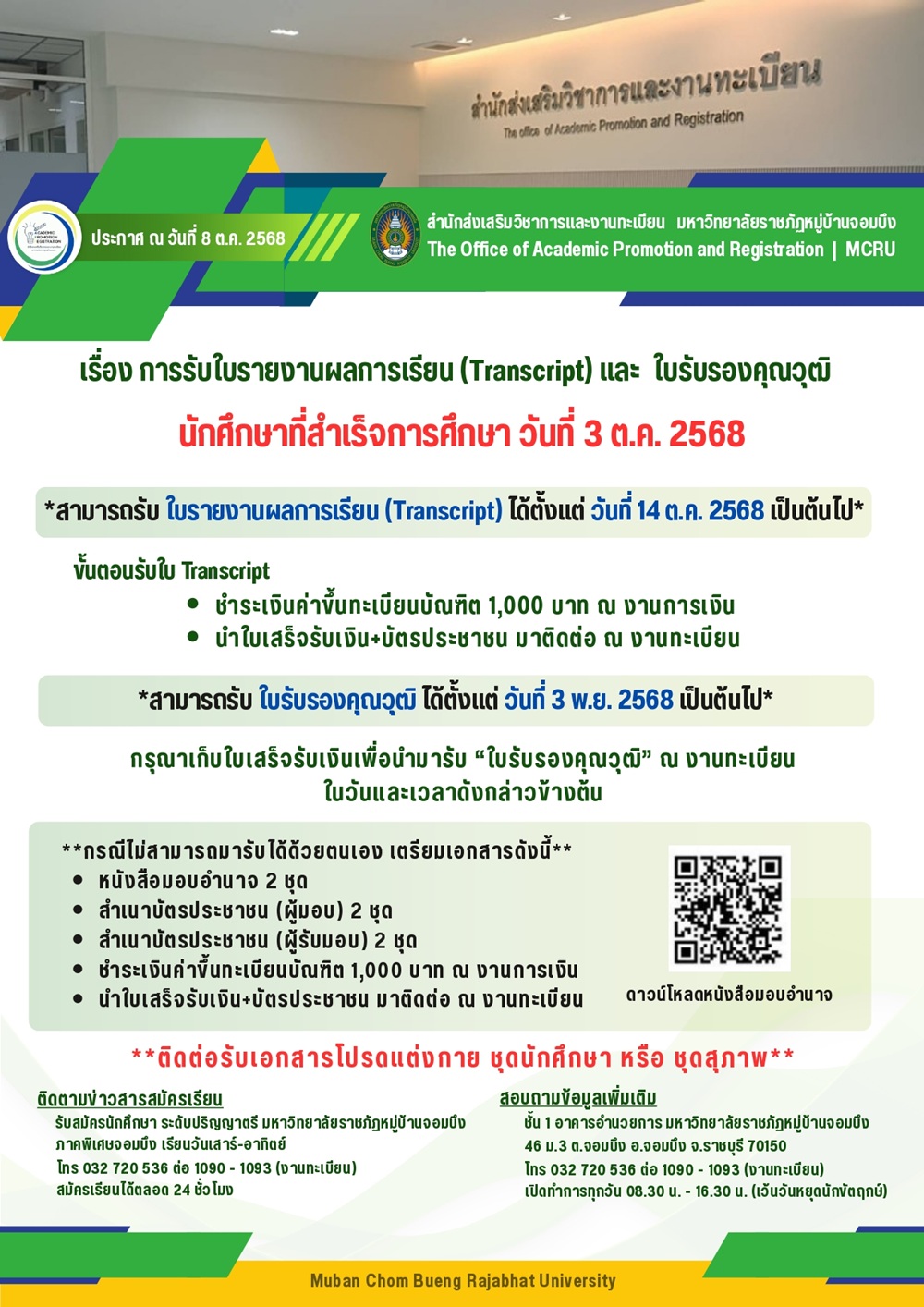 การรับเอกสารใบรายงานผลการเรียน (Transcript) และ ใบรับรองวุฒิ สำหรับนักศึกษาที่สำเร็จการศึกษา (รอบวันที่ 3 ตุลาคม 2568)