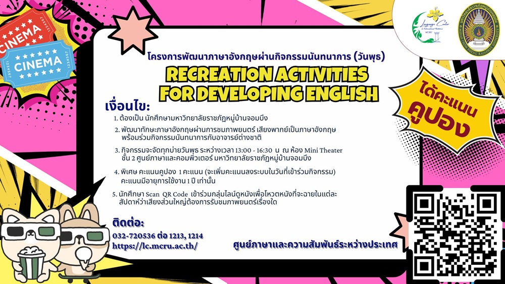 ศูนย์ภาษาและความสัมพันธ์ระหว่างประเทศ มหาวิทยาลัยราชภัฏหมู่บ้านจอมบึง ขอเชิญนักศึกษาทุกคณะ เข้าร่วมกิจกรรม โครงการพัฒนาภาษาอังกฤษผ่านกิจกรรมนันทนาการ (วันพุธ) เพื่อเสริมทักษะภาษาอังกฤษผ่านการชมภาพยนตร์ต่างประเทศในบรรยากาศเป็นกันเอง ณ ห้อง Mini Theater อาคารศูนย์ภาษาและคอมพิวเตอร์